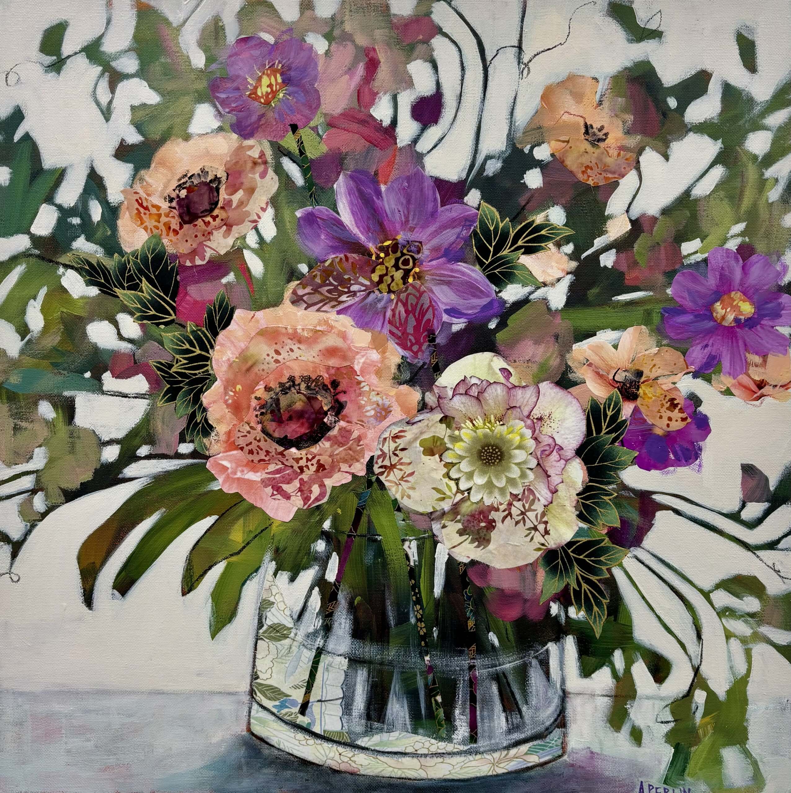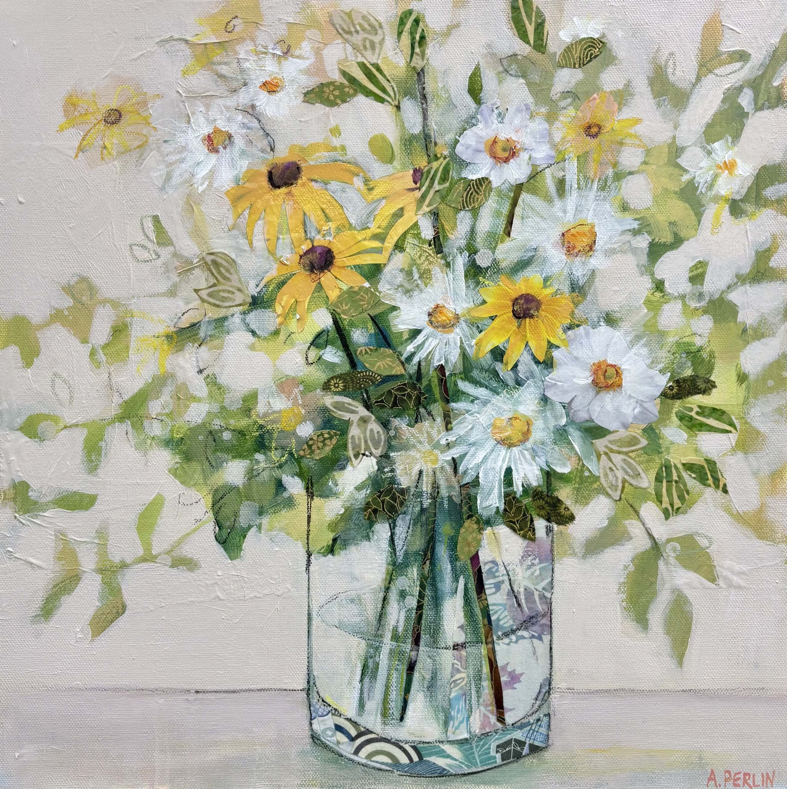 A mix of loose brush marks and negative space combined with mixed media and patterns found in fabric and paper collage create form and structure.