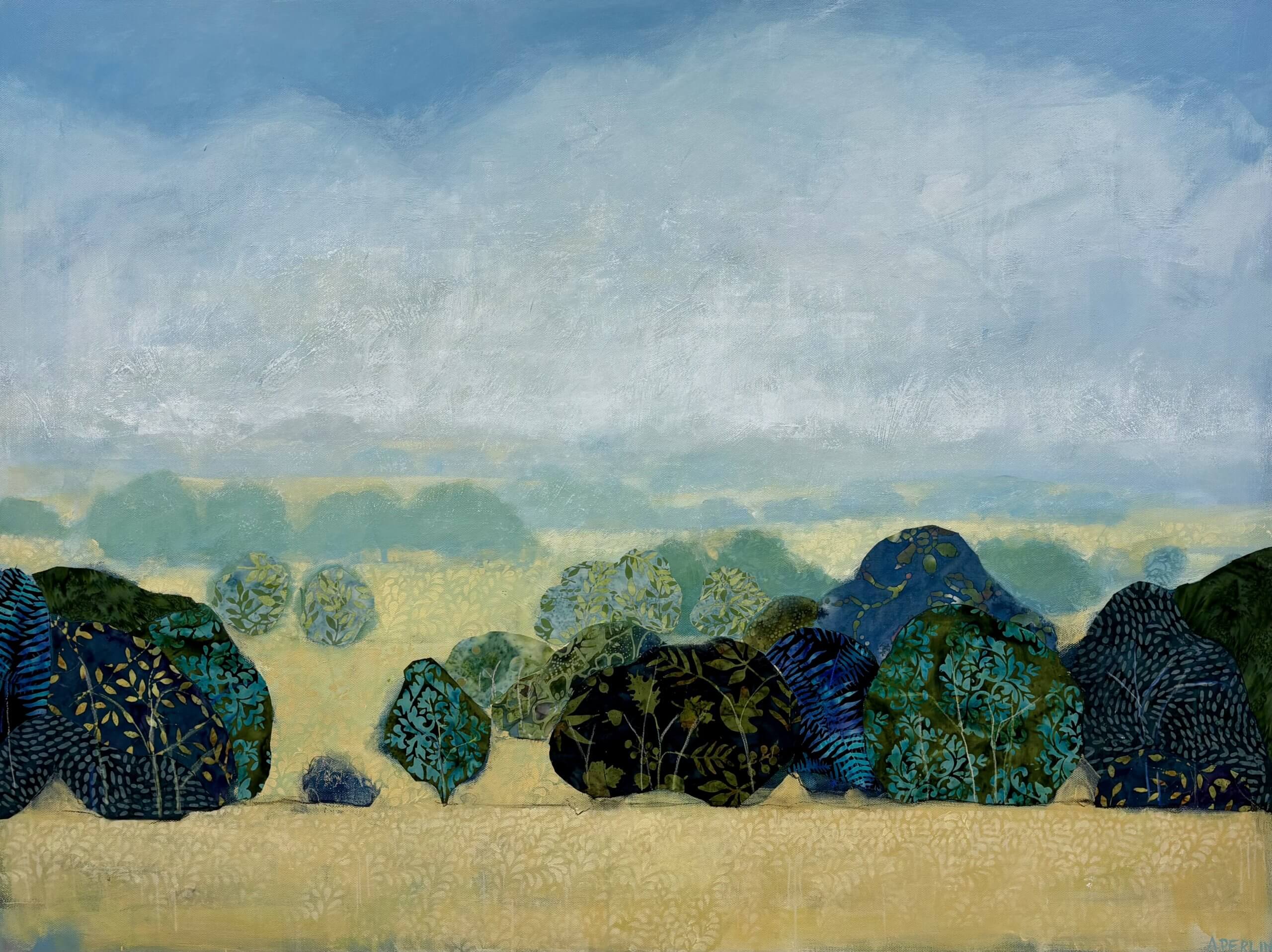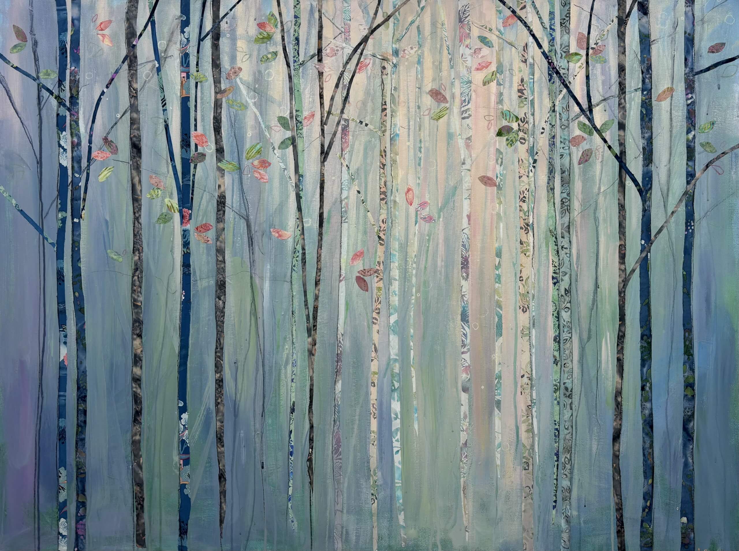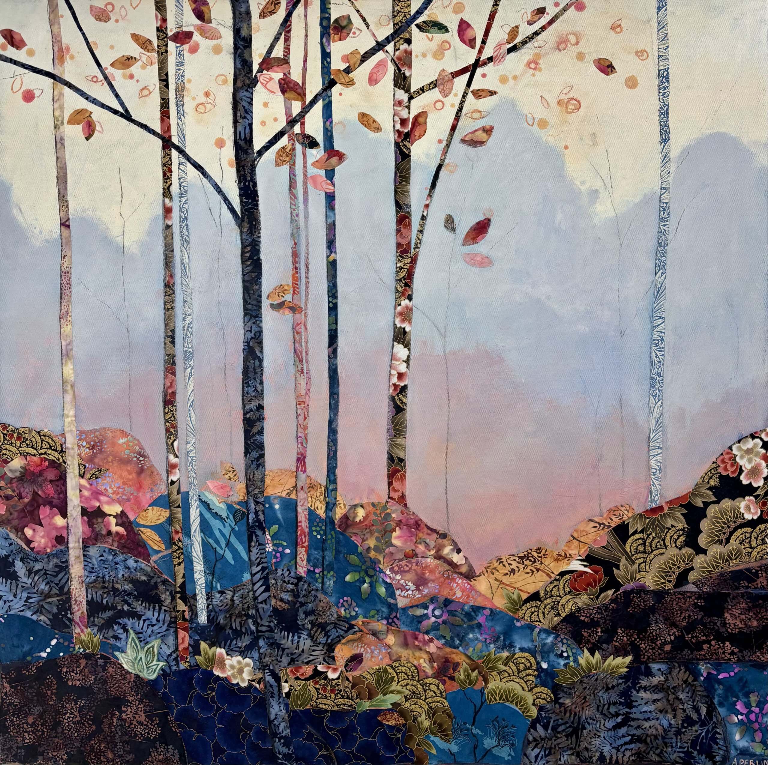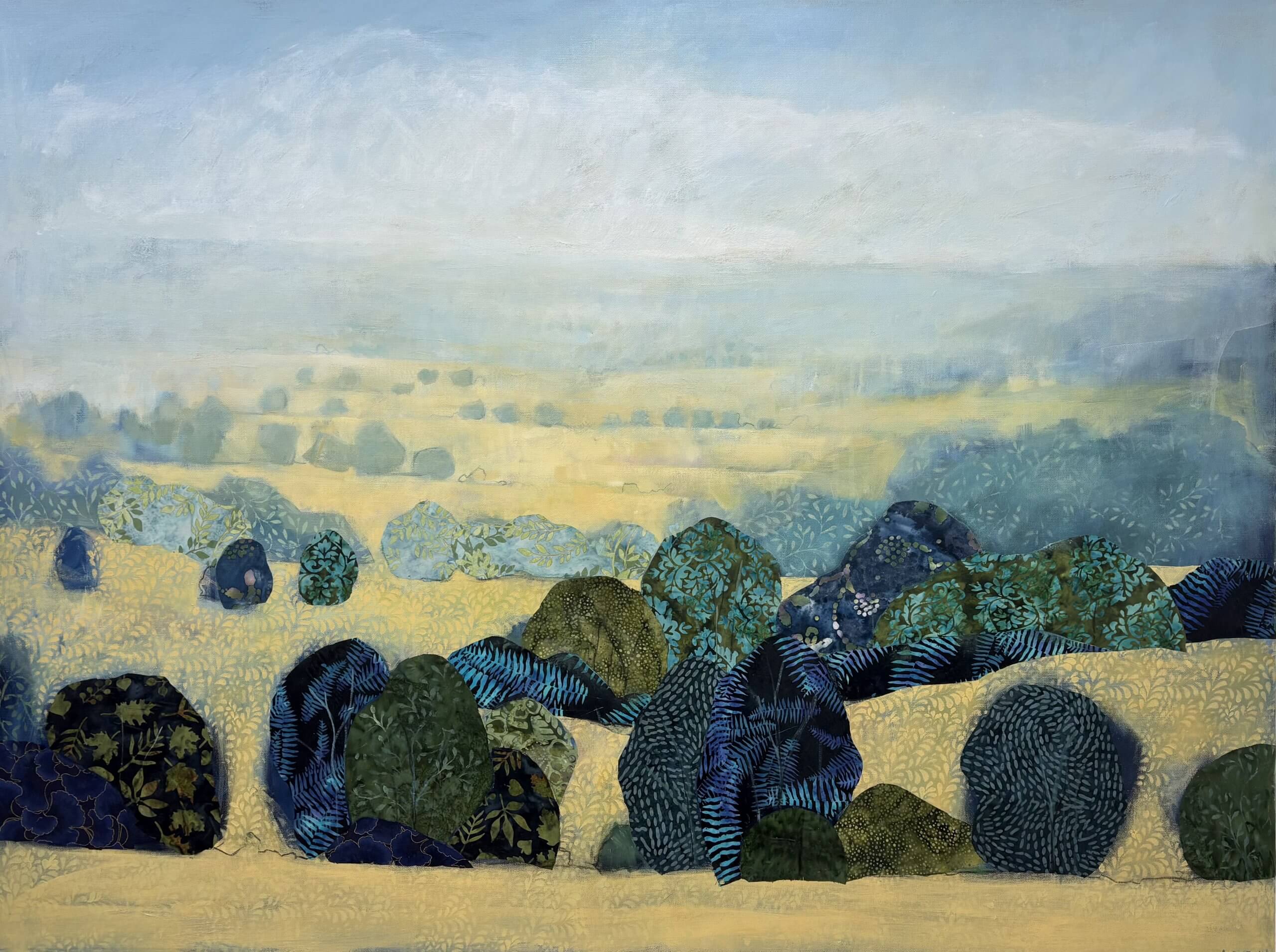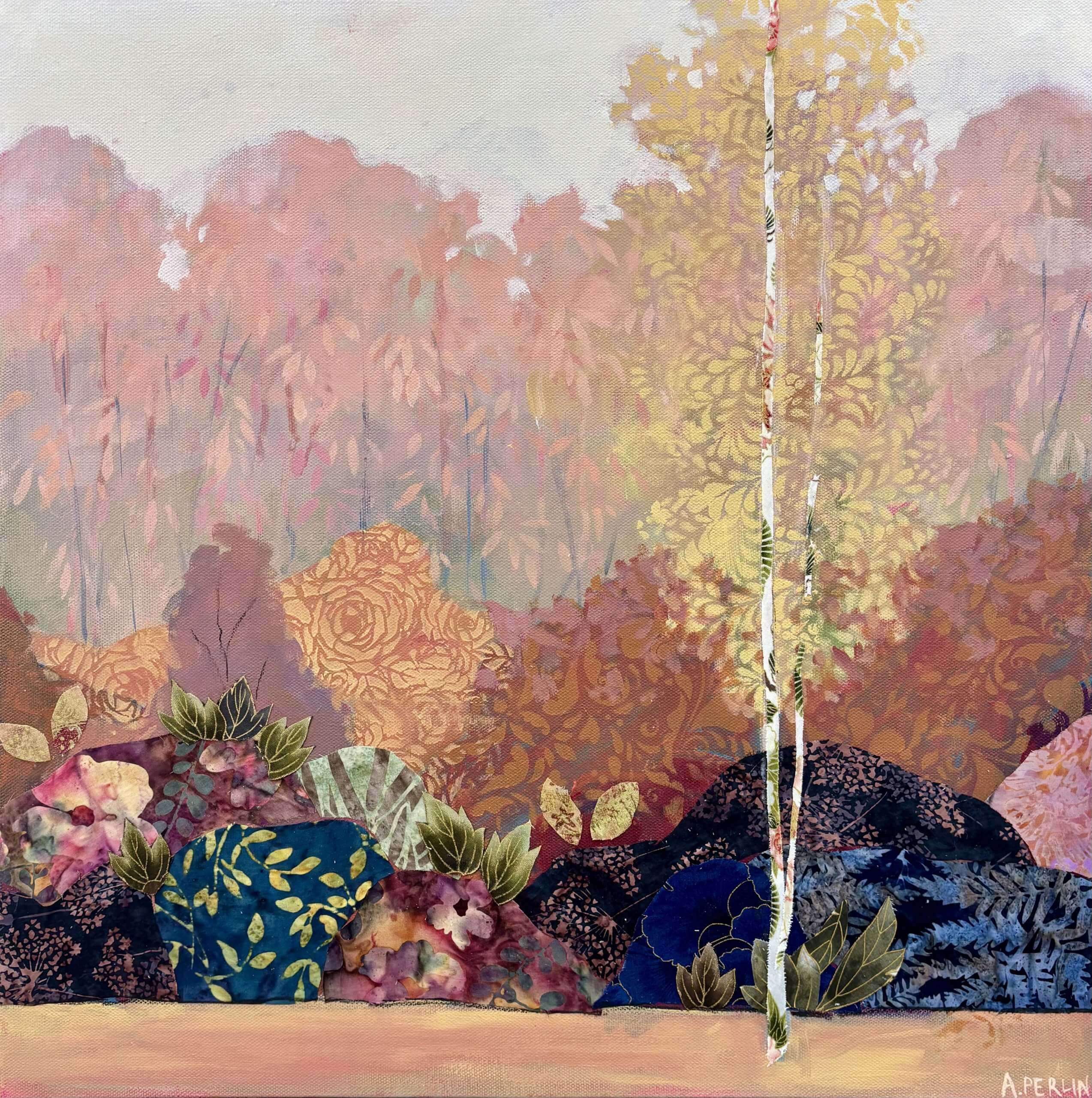 Collage is a big feature in my work and I use material collage to bring texture and depth to my paintings. I love sourcing material with interesting patterns and colours which I pull out and highlight throughout a painting with a combination of mixed media – paint, pastel, charcoal and other collage.