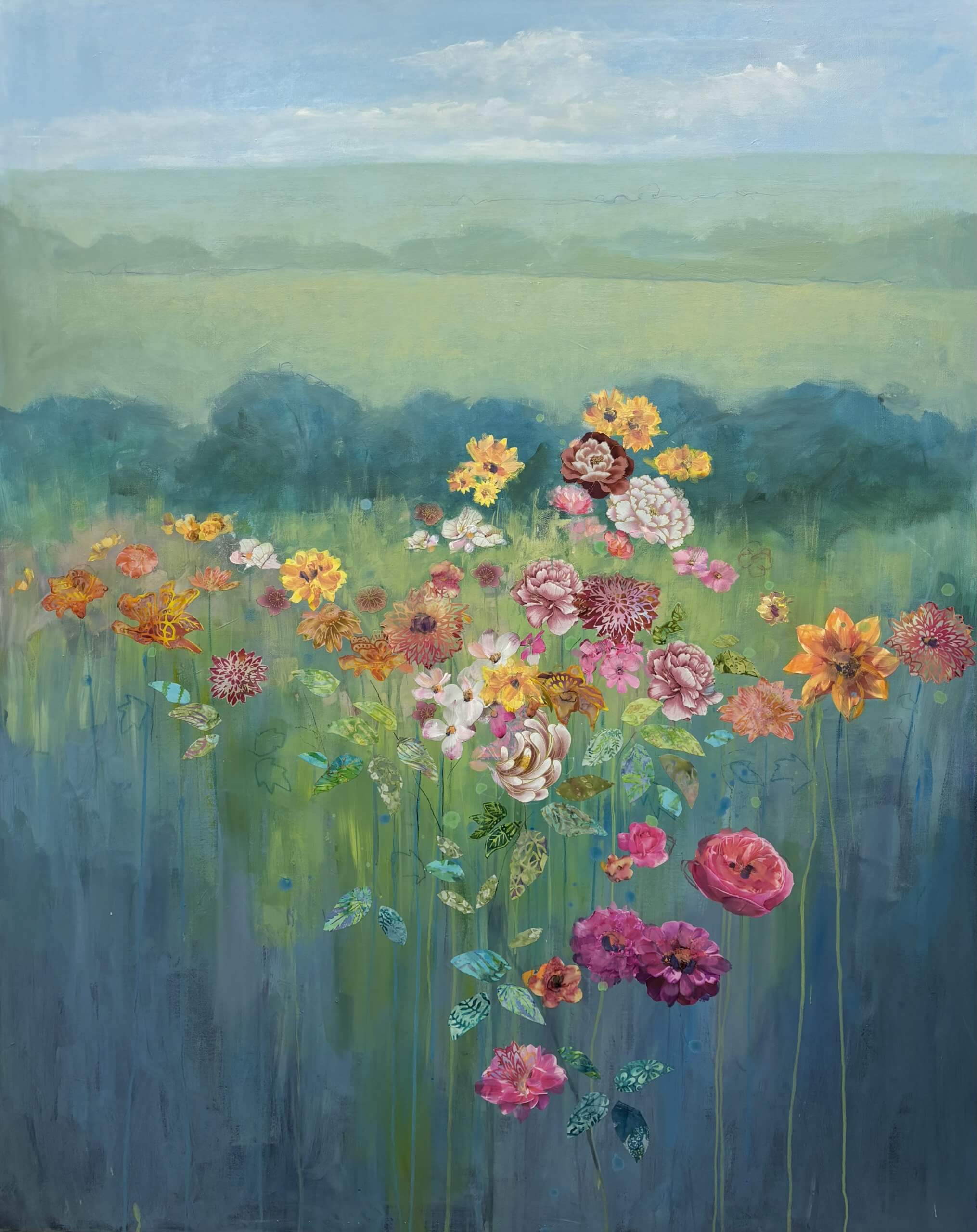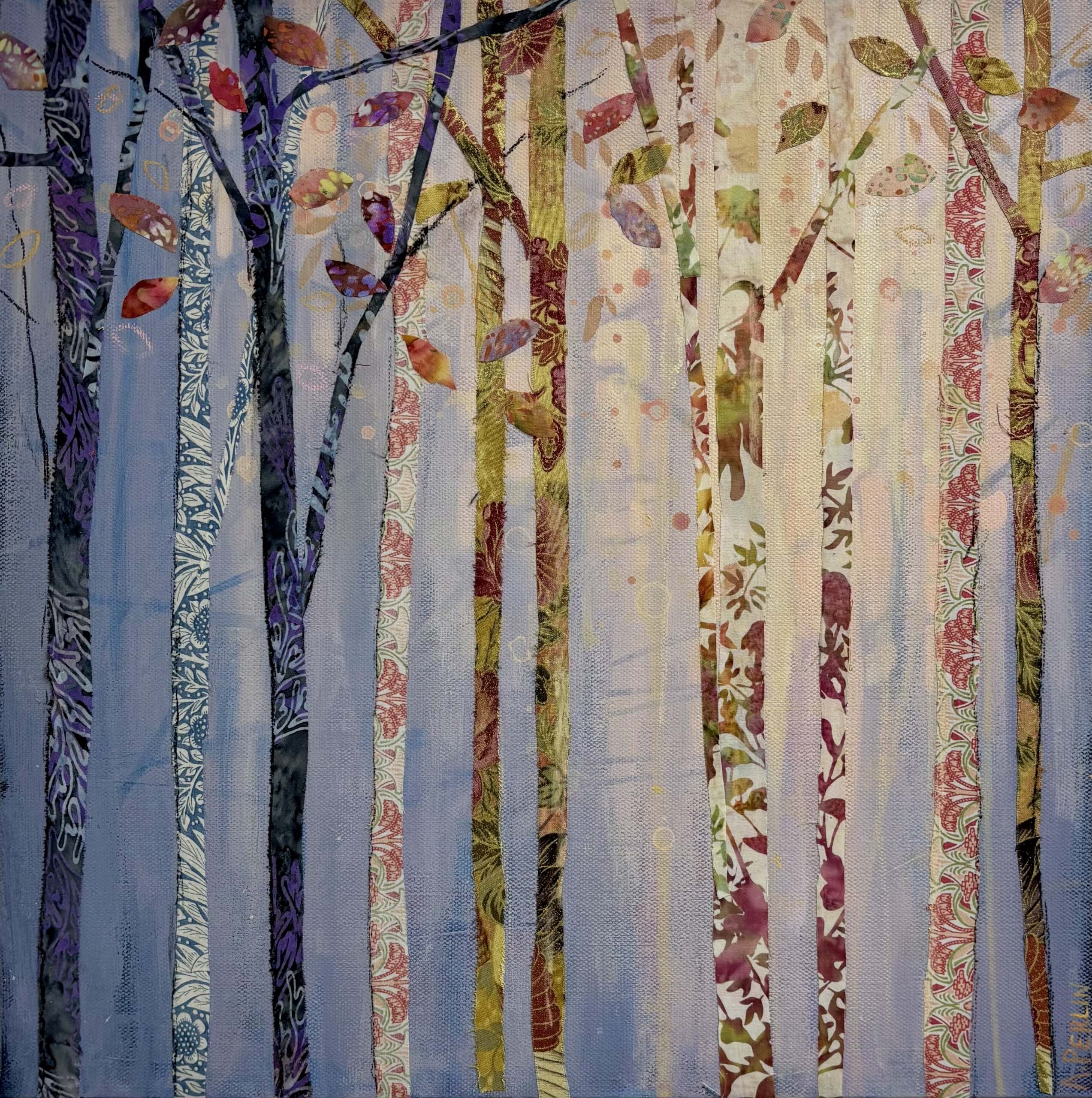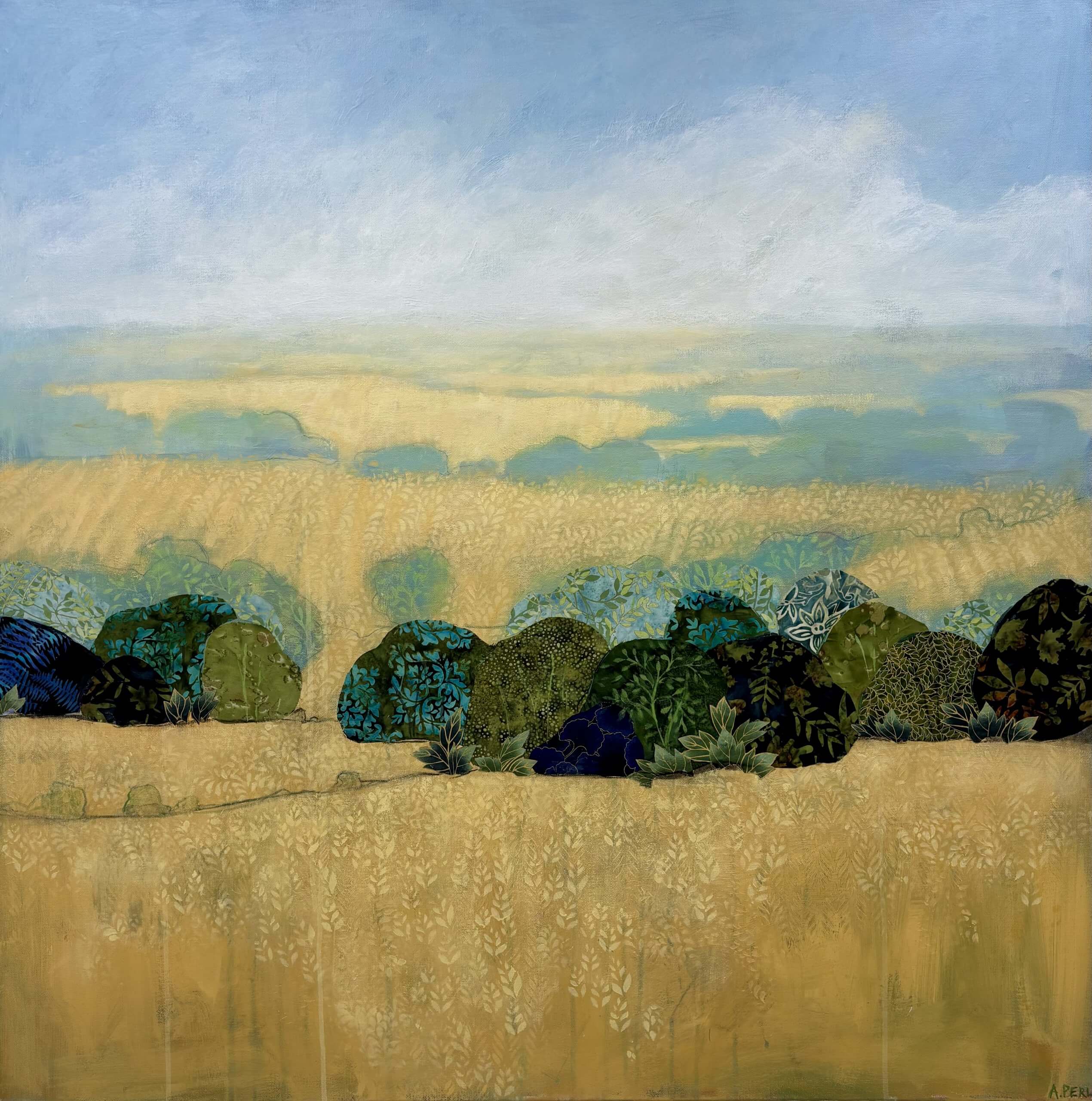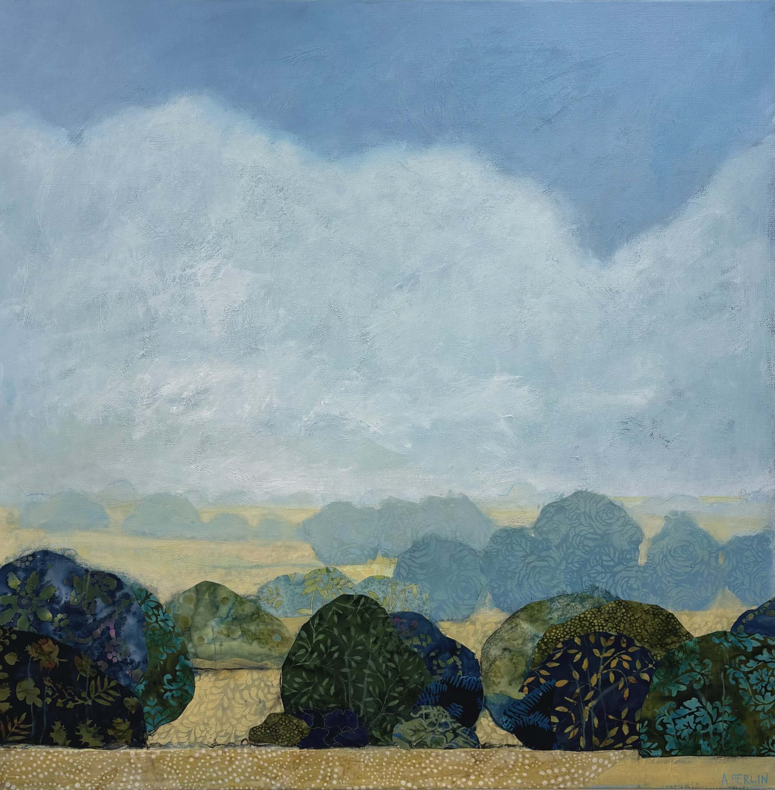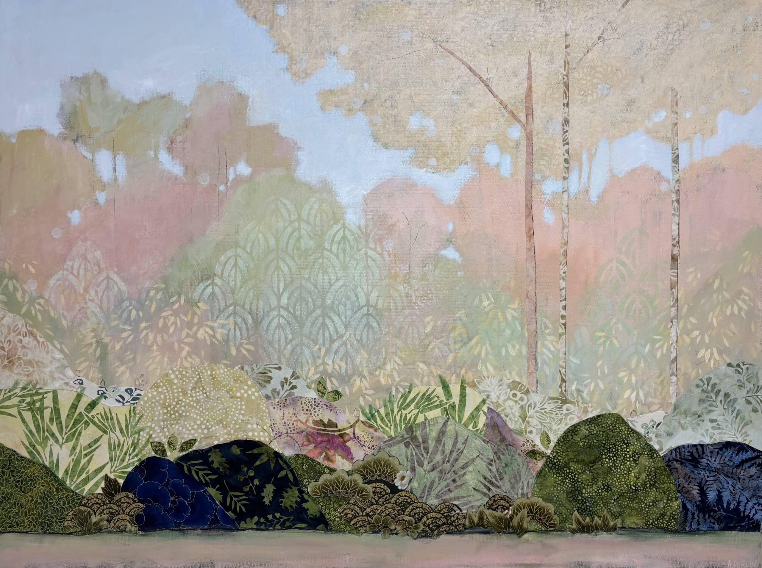 Collage is a big feature in my work and I use material collage to bring texture and depth to my paintings. I love sourcing material with interesting patterns and colours which I pull out and highlight throughout a painting with a combination of mixed media – paint, pastel, charcoal and other collage.