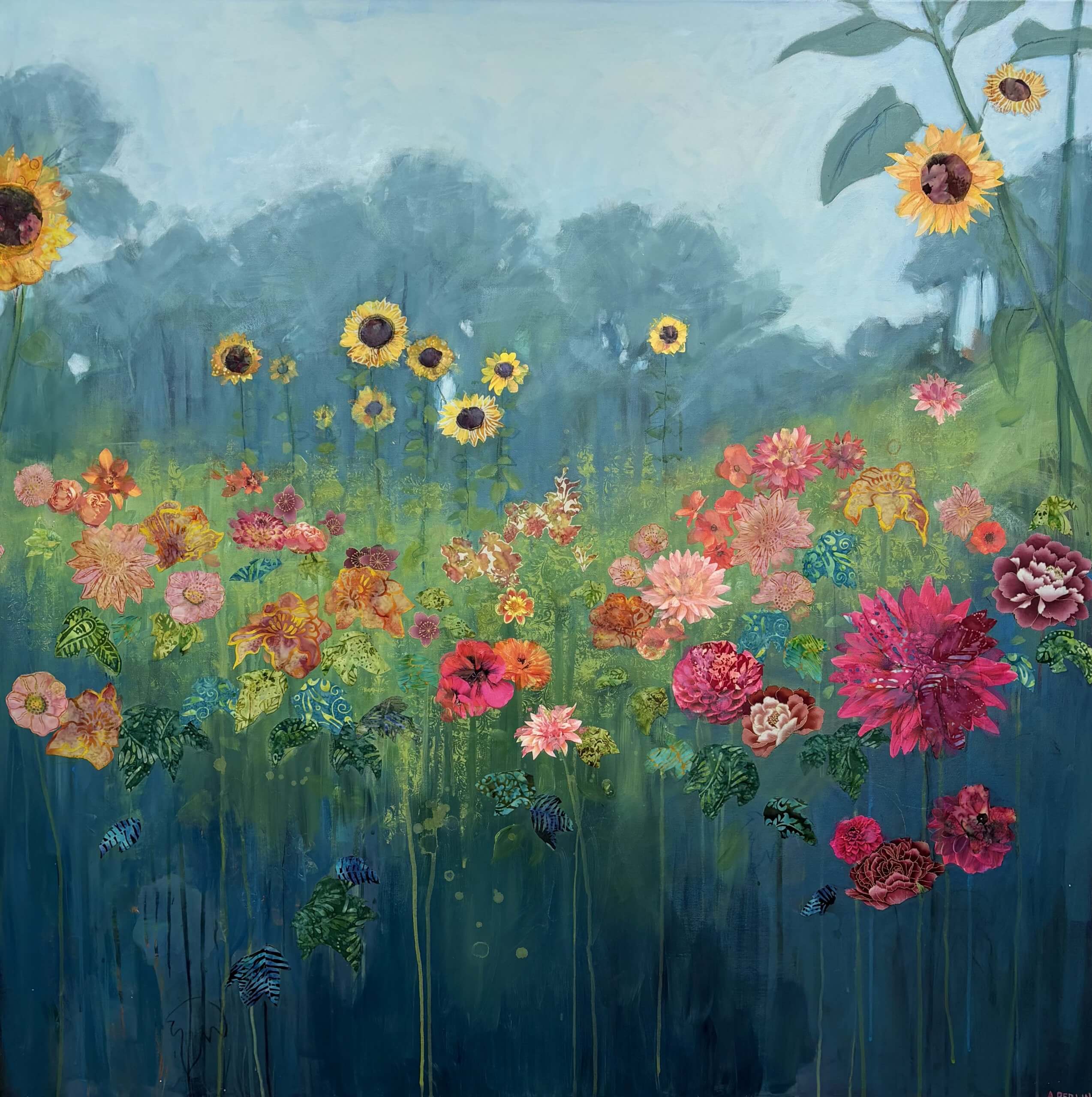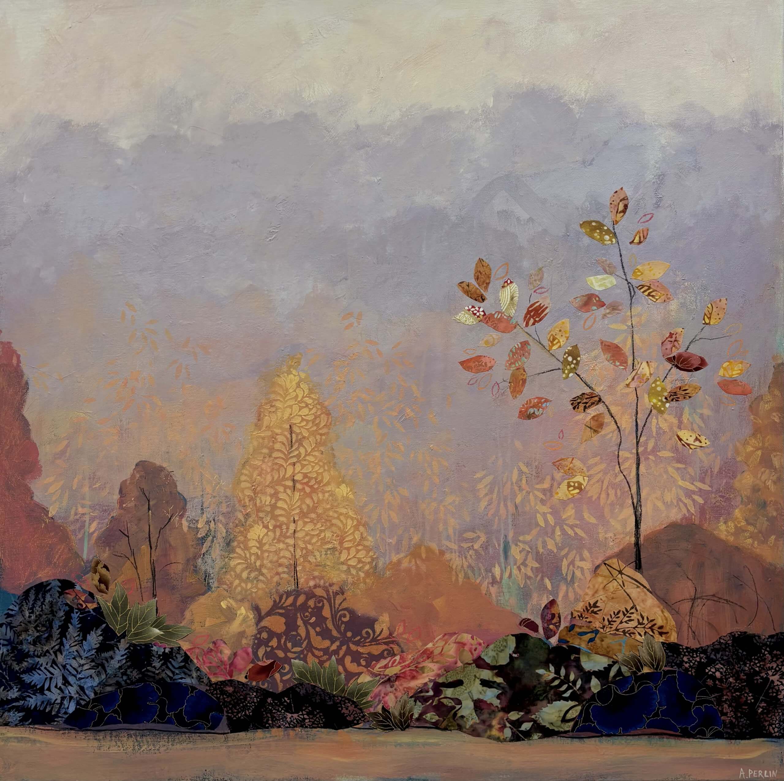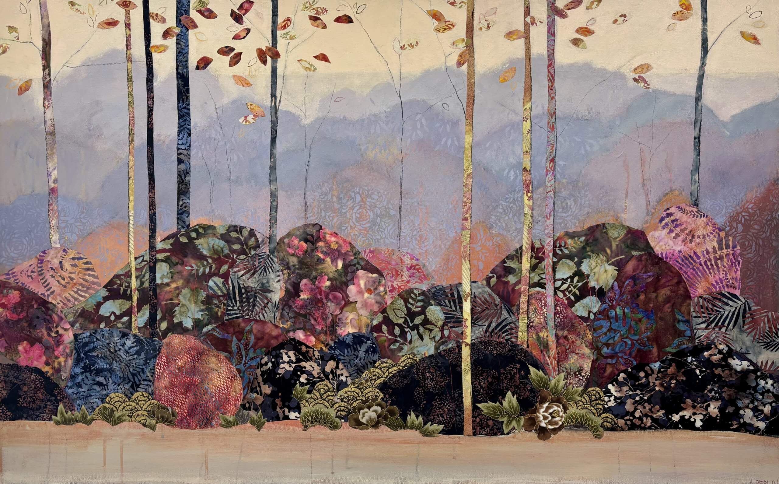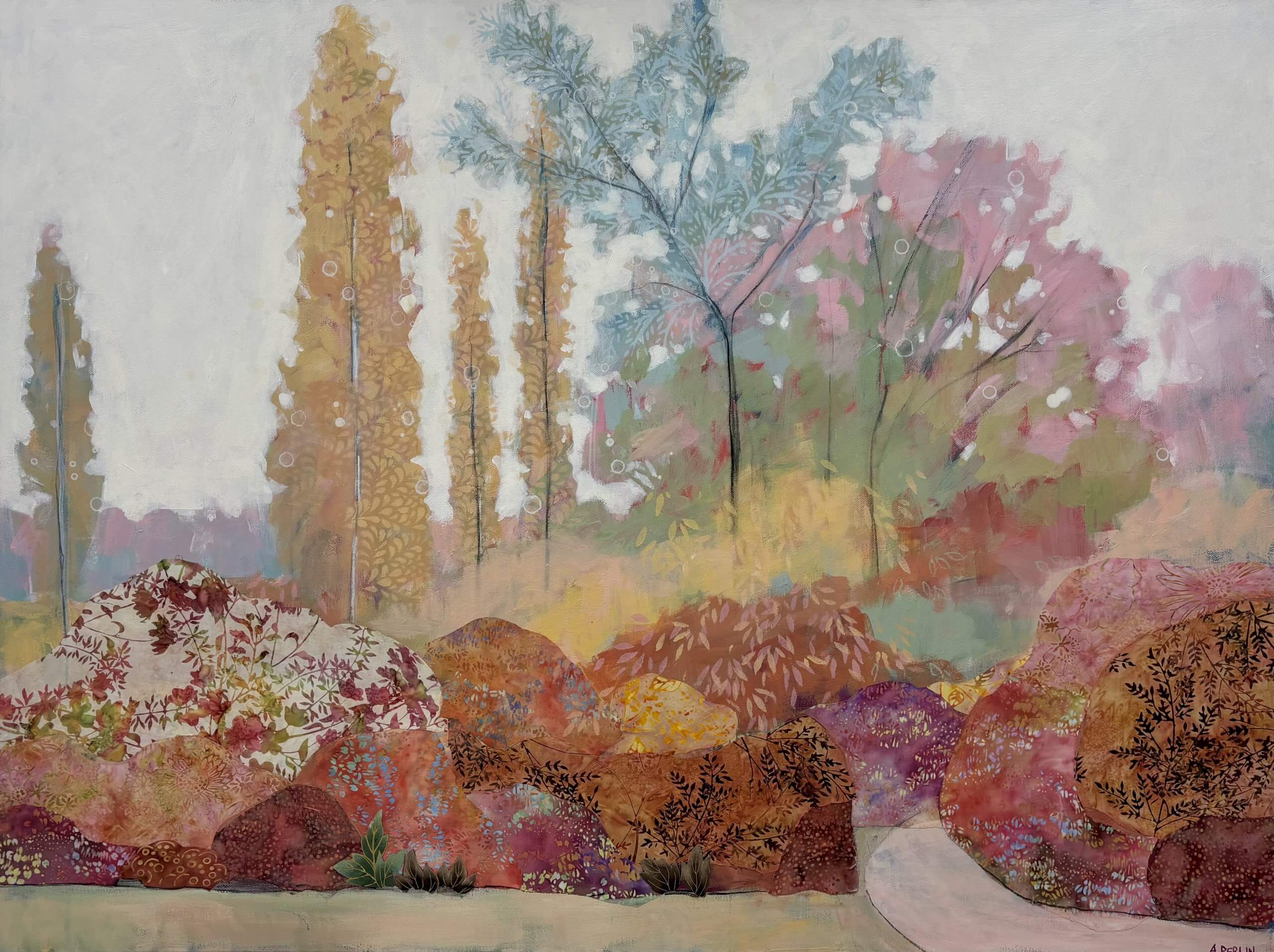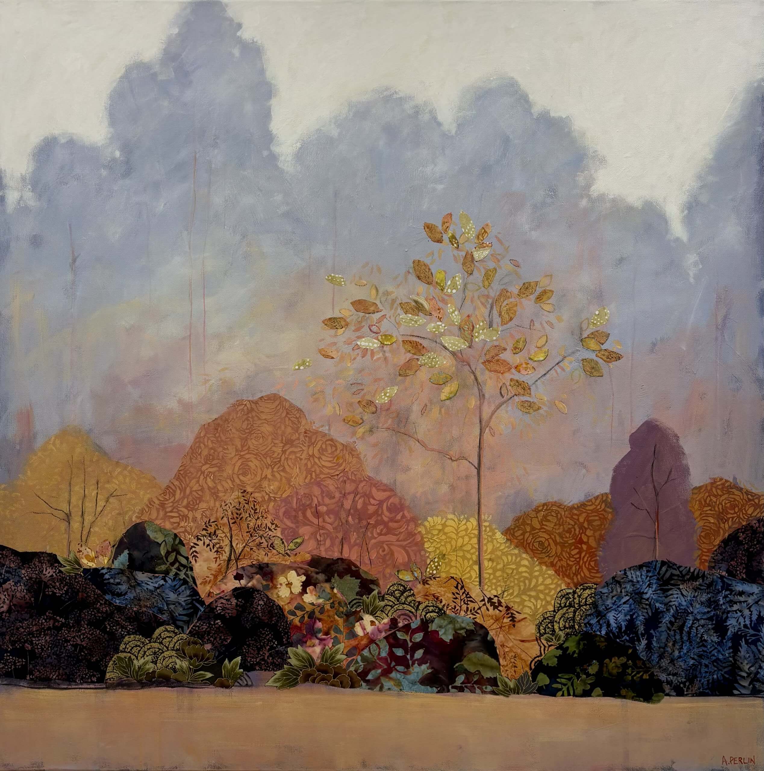 Collage is a big feature in my work and I use material collage to bring texture and depth to my paintings. I love sourcing material with interesting patterns and colours which I pull out and highlight throughout a painting with a combination of mixed media – paint, pastel, charcoal and other collage.